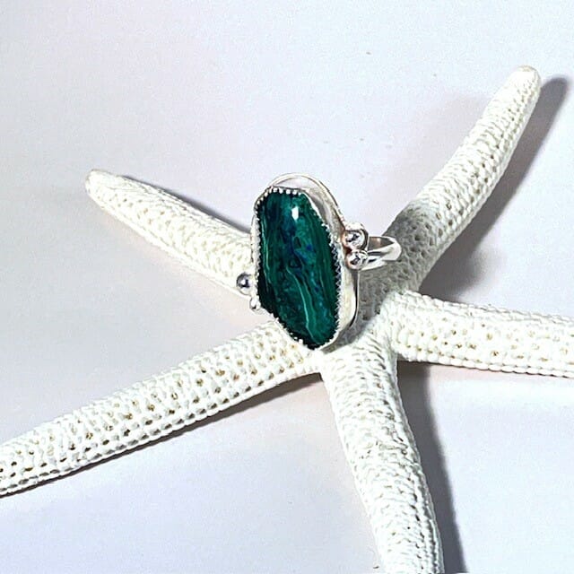 - Peruvian malachite is set in silver saw tooth bezel on silver ring